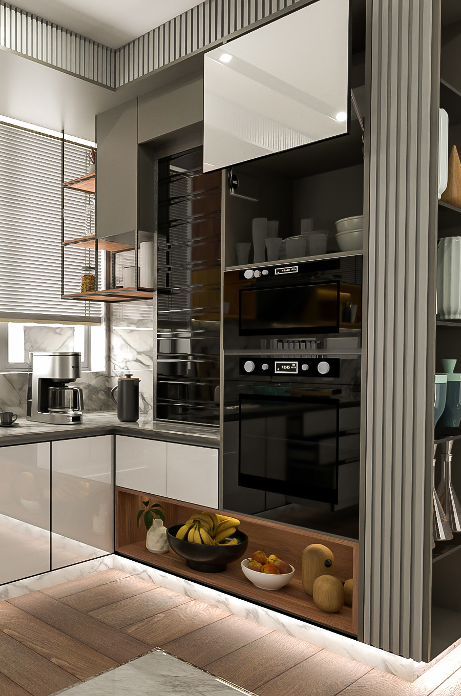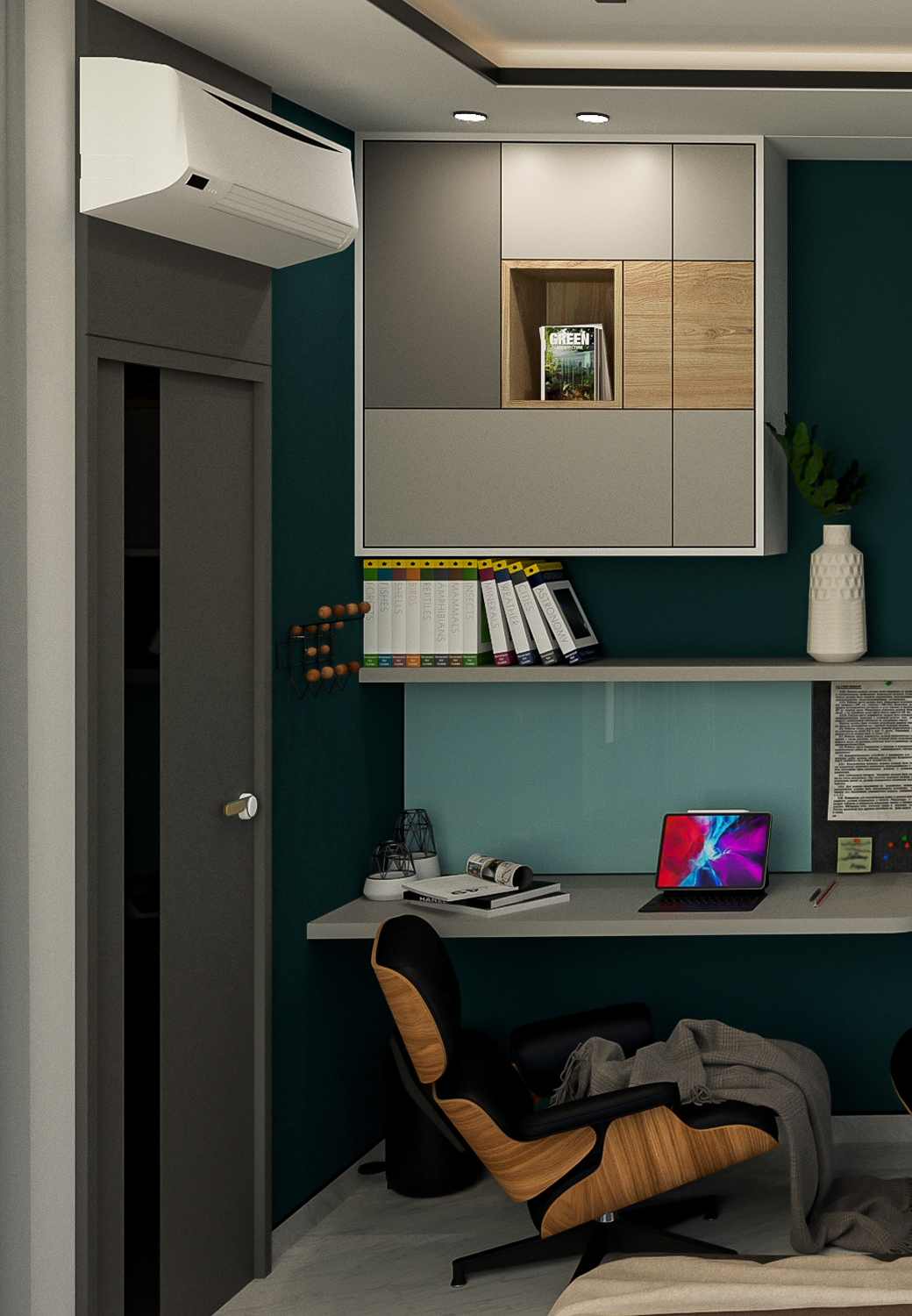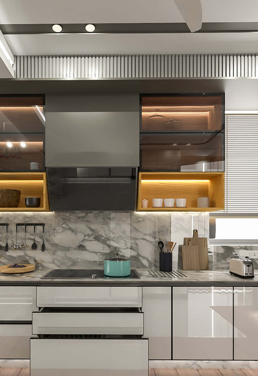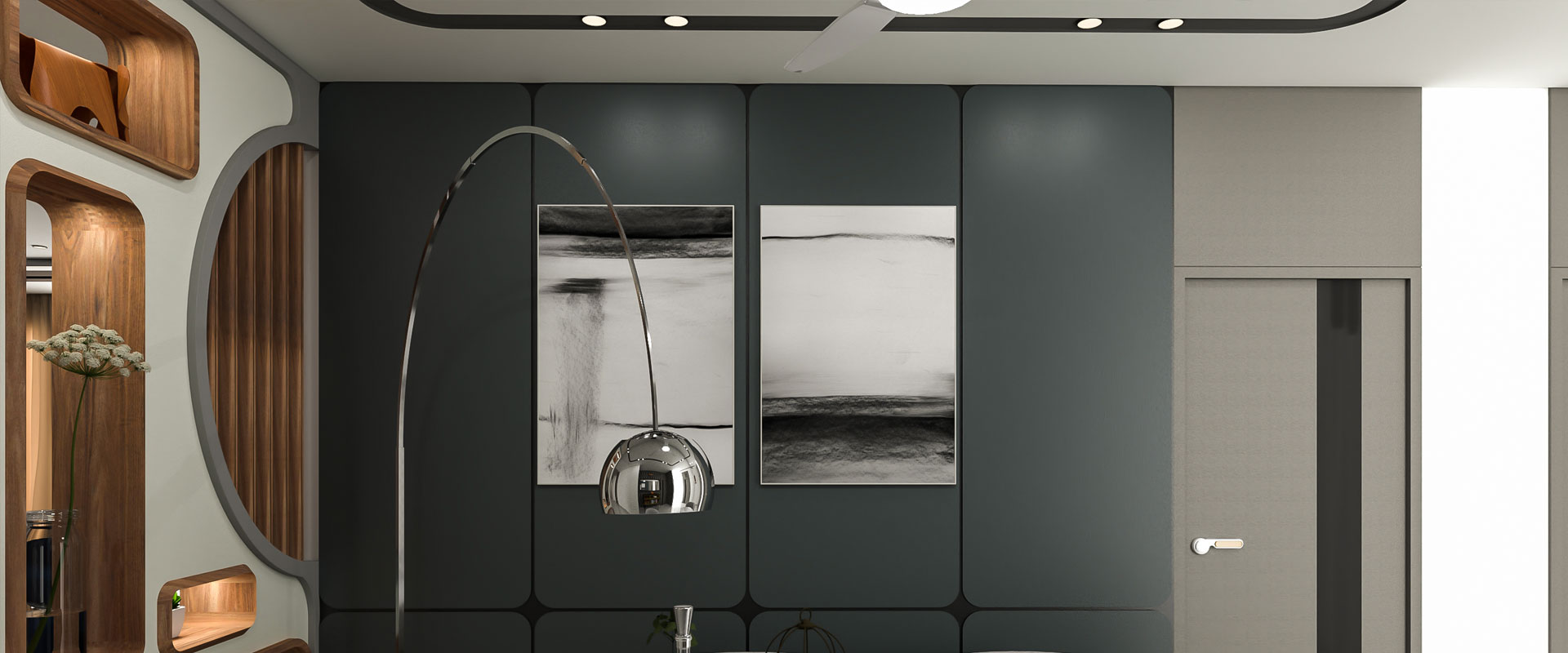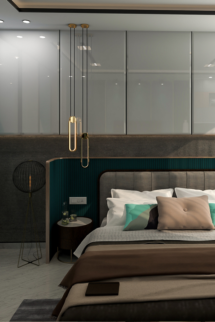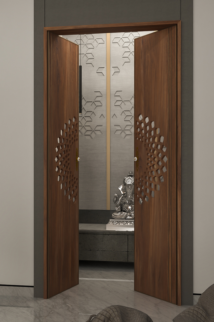 Aarunya Nivasa, meaning “Abode of the First Light,” is a home where modern elegance meets soulful living. From the sunlit living room with deep blue seating and sculptural lighting to the serene puja room guarded by intricately carved wooden doors, every space radiates calm and purpose.
