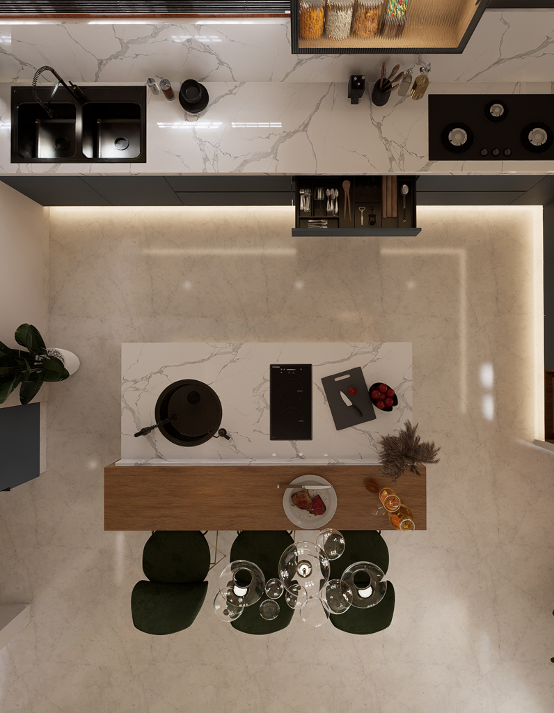 Inside, the home is grounded with the natural elegance of Kota stone flooring in every room—a material choice that brings both durability and an earthy charm.