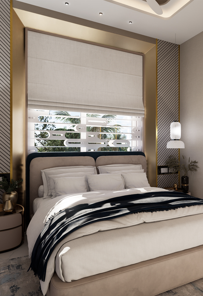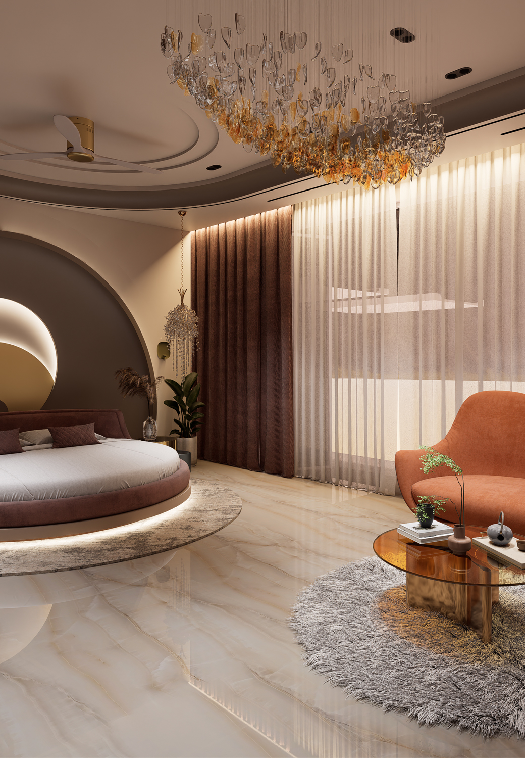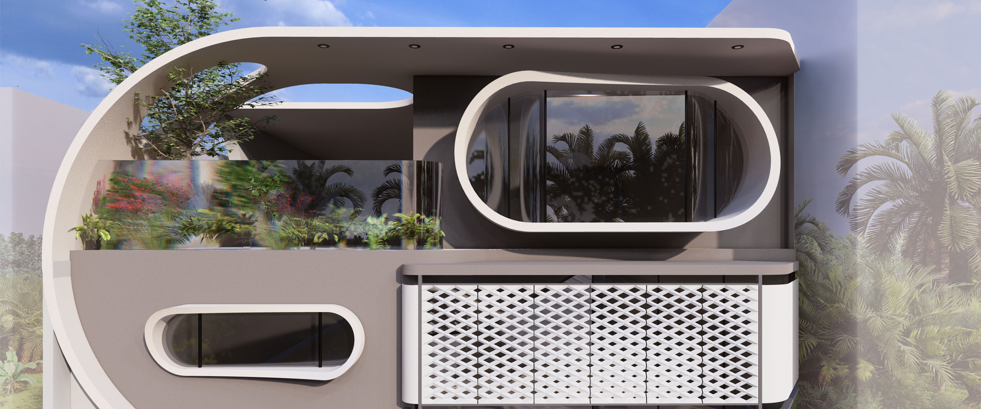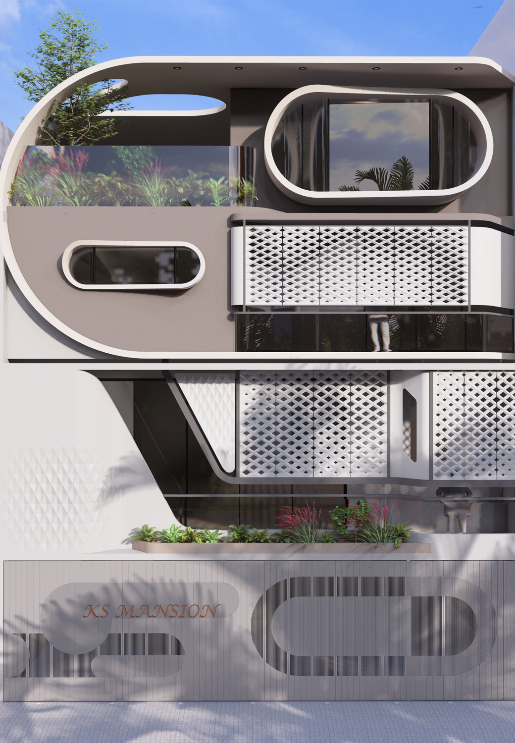 The elevation is defined by its sculpted curves and bold forms, where walls flow seamlessly to form a rhythmic façade. Light filters through parametric patterns, softening the structure while ensuring privacy and ventilation.