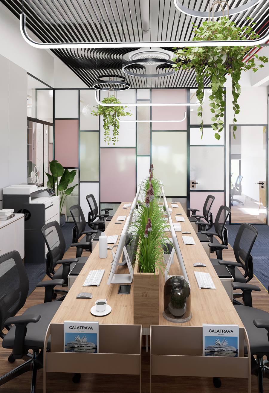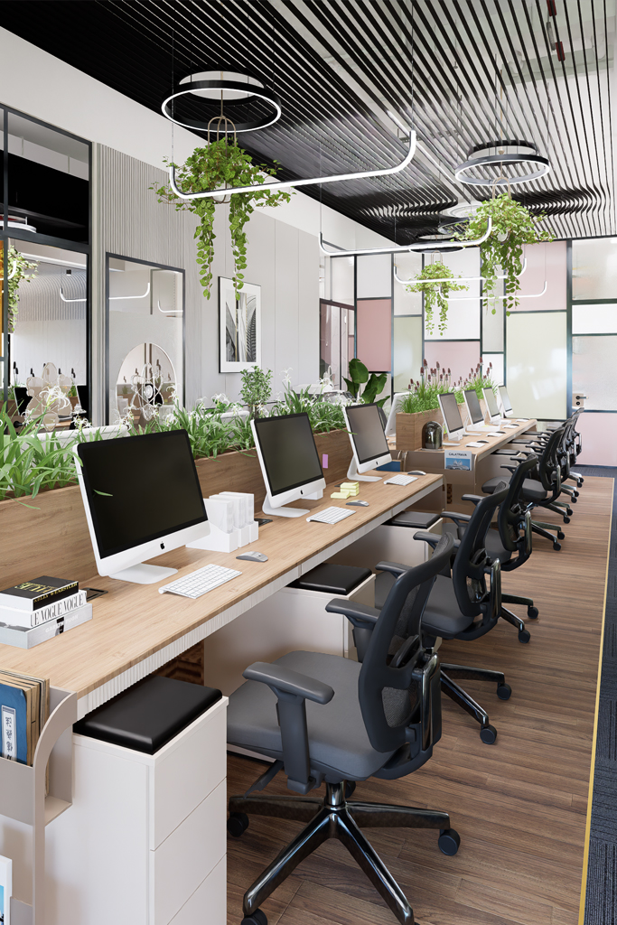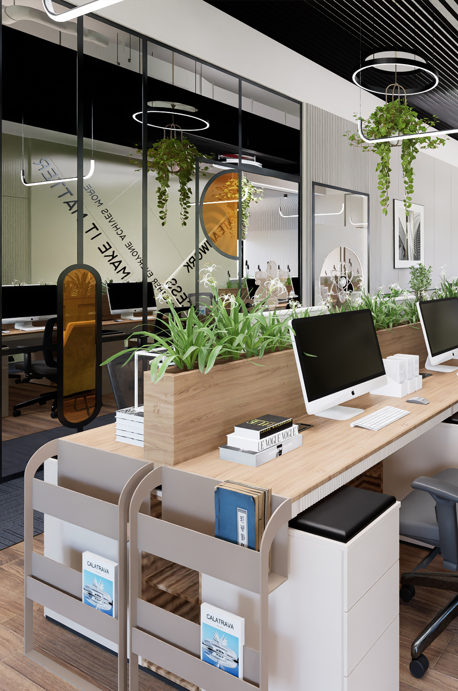 Medphy technologies is a thoughtfully crafted office environment that blends minimalism, greenery, and modern ergonomics. The design focuses on enhancing productivity through biophilic elements, warm materials, and clean visual flow. Natural light filters through translucent partitions, energizing the workspace while maintaining privacy. Centralized collaborative desks encourage interaction and team synergy, surrounded by lush indoor plants that promote calm and focus.