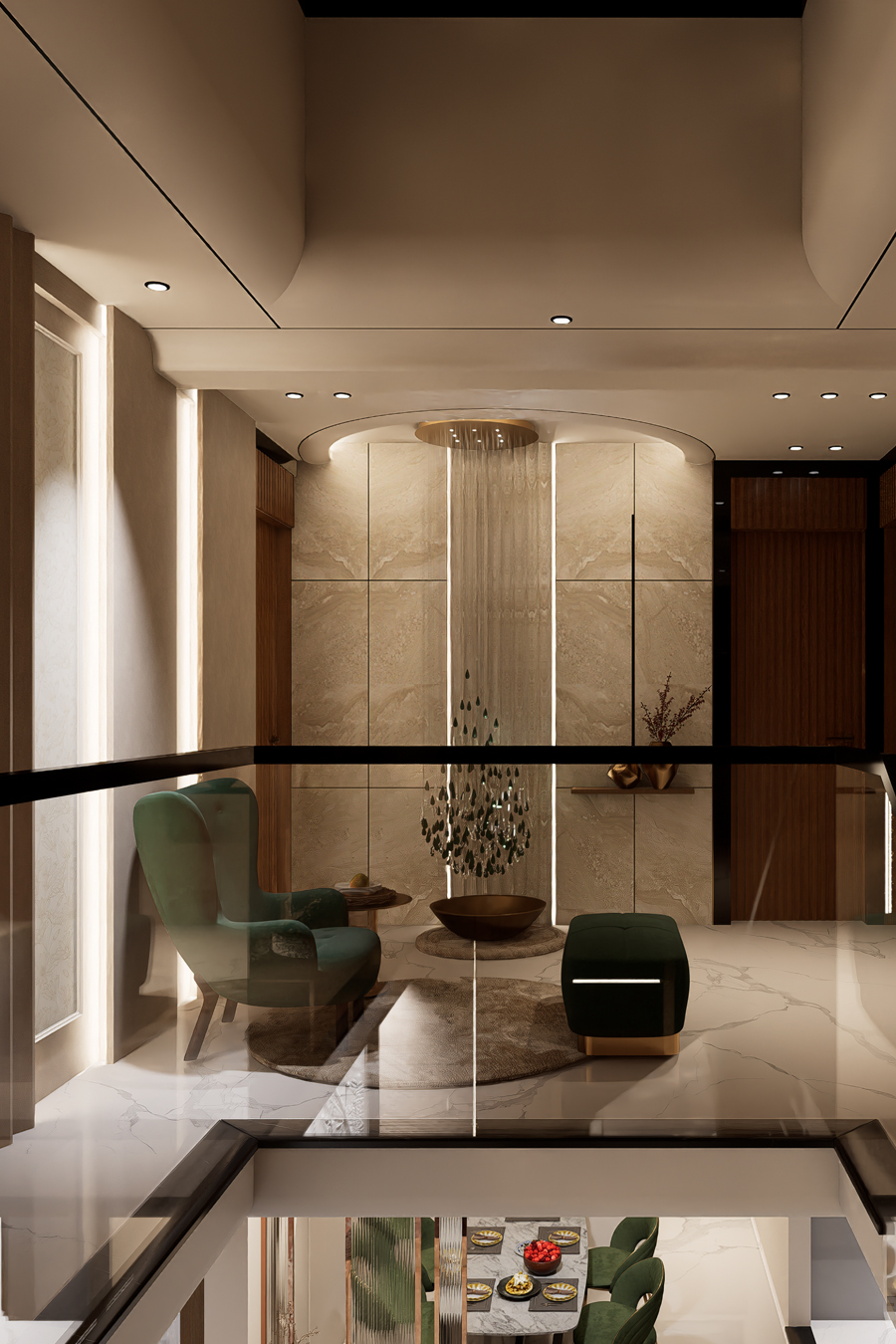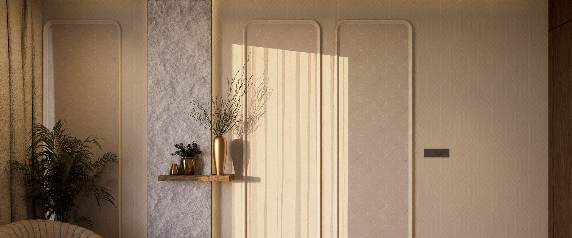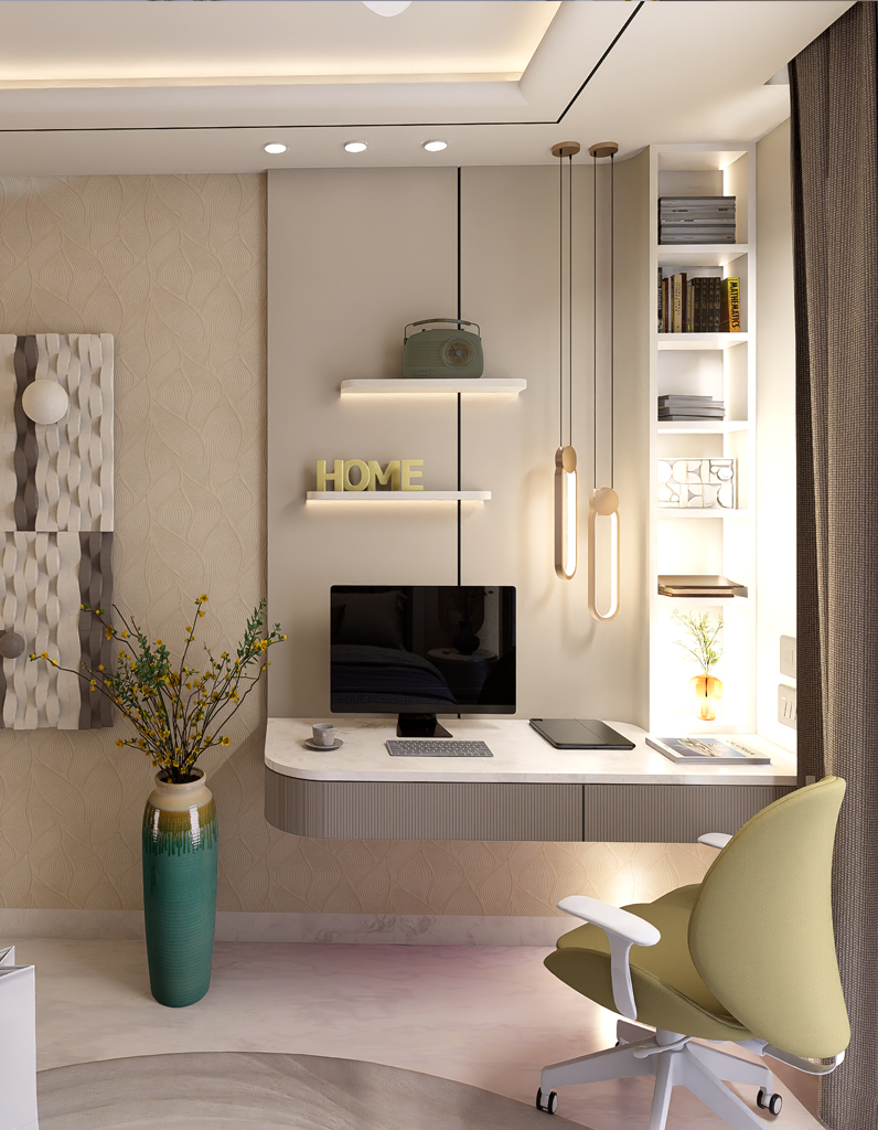 Saanjh Vilaas unfolds as a home full of warmth and character. The living area is designed around a unique indoor landscape, bringing nature inside.A floral wall moulding panel adds an artistic charm to the feature wall. The open kitchen becomes an eye-catching centerpiece, blending style with function.