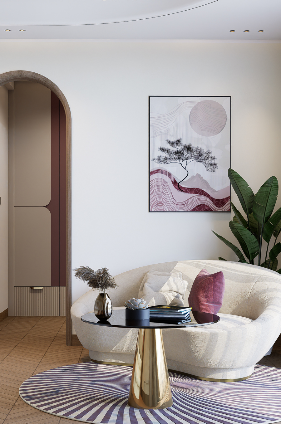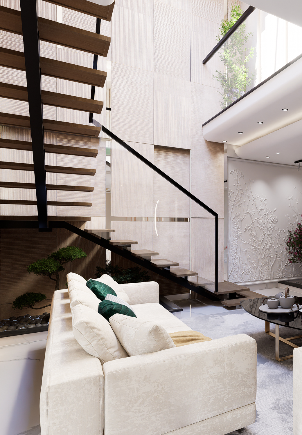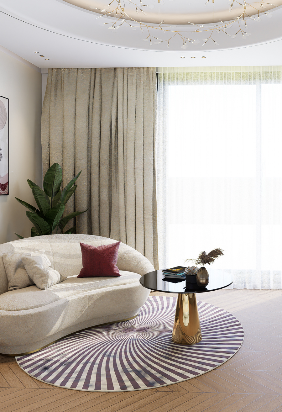 Saanjh Vilaas unfolds as a home full of warmth and character. The living area is designed around a unique indoor landscape, bringing nature inside.A floral wall moulding panel adds an artistic charm to the feature wall. The open kitchen becomes an eye-catching centerpiece, blending style with function.