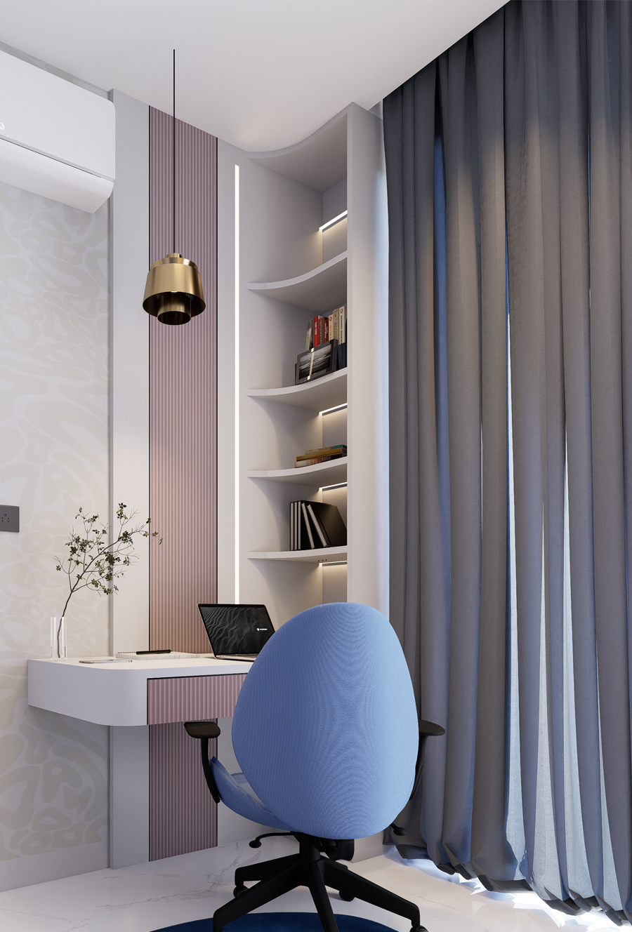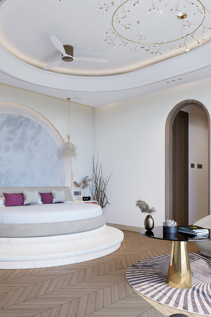 The kids’ bedroom is playful and vibrant, a true favorite within the home. The master bedroom is crafted with luxury as its defining element. At the heart of it lies a custom-designed round bed, a special client request. Saanjh Vilaas perfectly balances innovation, comfort, and personalized design